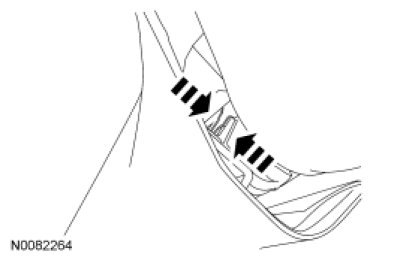 Pull the A-pillar trim panel toward the center of the vehicle to release the first stage of the A-pillar trim panel upper 2-stage, high-retention retaining clip and the center A-pillar trim panel retaining clips.