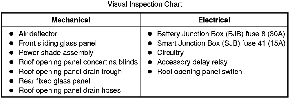 4. If the concern is not visually evident, determine the symptom. GO to Symptom Chart - Roof Opening Panel or GO to Symptom Chart - NVH. Symptom Chart - Roof Opening Panel Symptom Chart - NVH