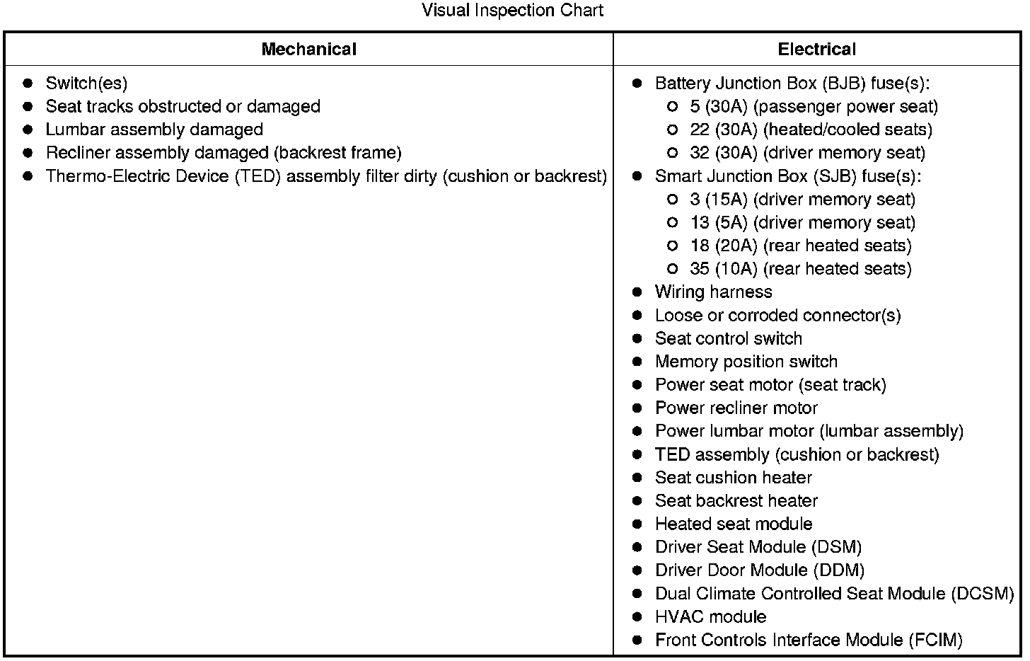 4. If the concern is with the power seat (non-memory seat) or heated seat and the cause is not visually evident, verify the symptom and GO to Symptom Chart. Symptom Related Diagnostic Procedures