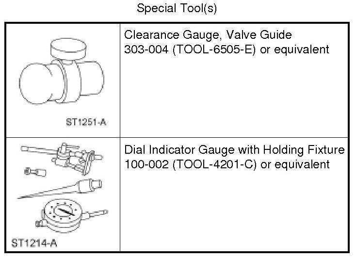 Install a Valve Guide Clearance Gauge on the valve stem and install a Dial Indicator Gauge with Holding Fixture. Lower the valve until the clearance gauge contacts the upper surface of the valve guide.