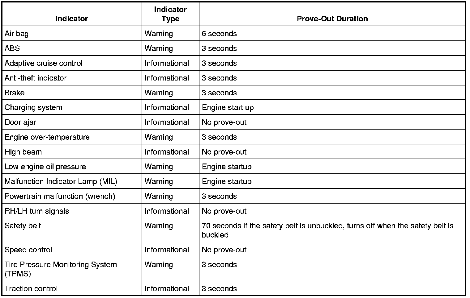 The IPC carries out a display prove-out to verify that all module controlled warning/indicator lamps and monitored systems are functioning correctly within the IPC. When the ignition is in the ON mode with the engine off, the indicators illuminate to prove-out according the following table: