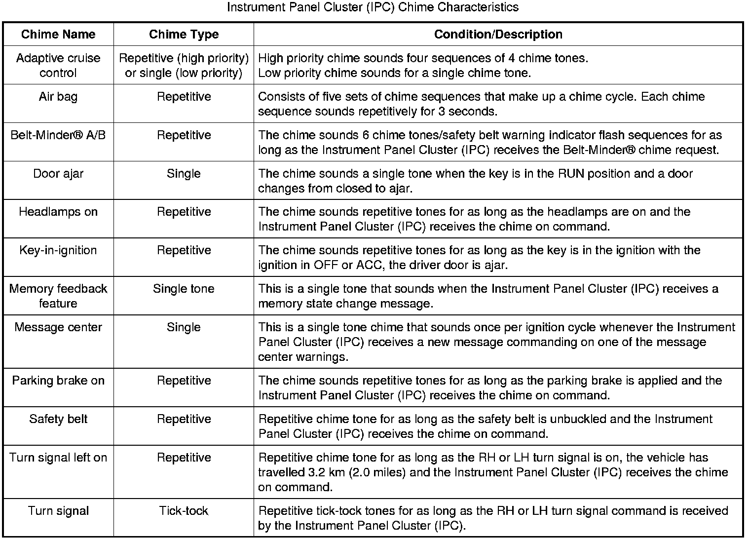 Instrument Panel Cluster (IPC) Chime Characteristics: