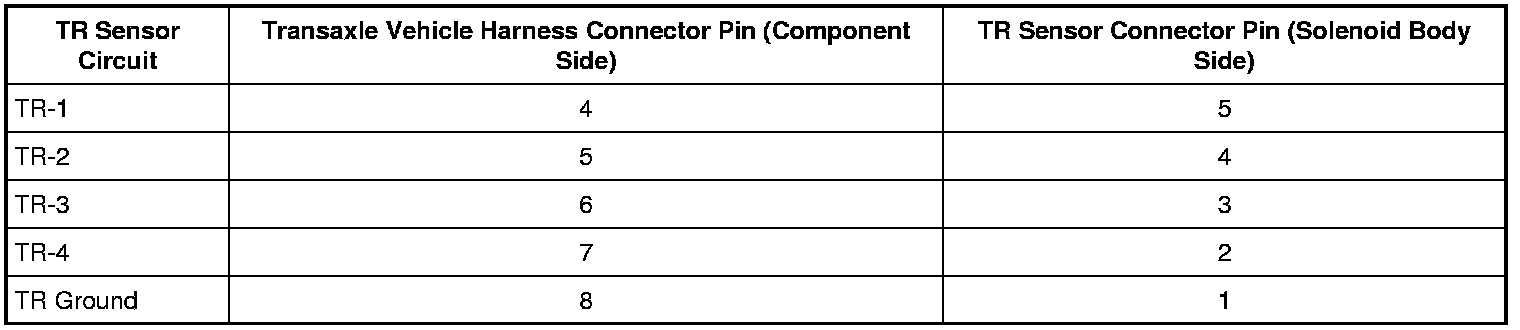 NOTE: Refer to the Transmission Range (TR) Sensor Connector illustration Transaxle Connector Layouts Symptom Related Diagnostic Procedures.