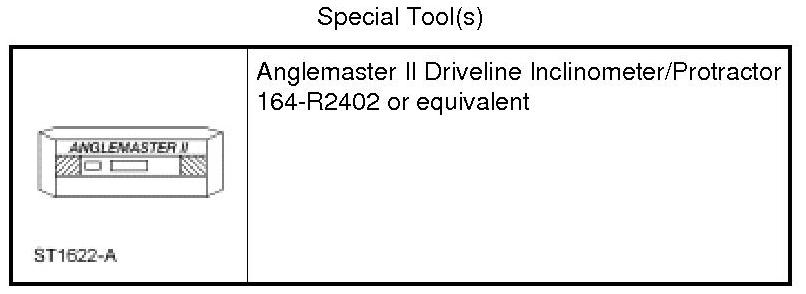 6. If the angle is not within specifications, repair or adjust to obtain the correct angle. Inspect the engine mounts, transmission mounts, center support bearing mounting, rear suspension, rear axle, rear axle mounting or the frame for wear or damage.