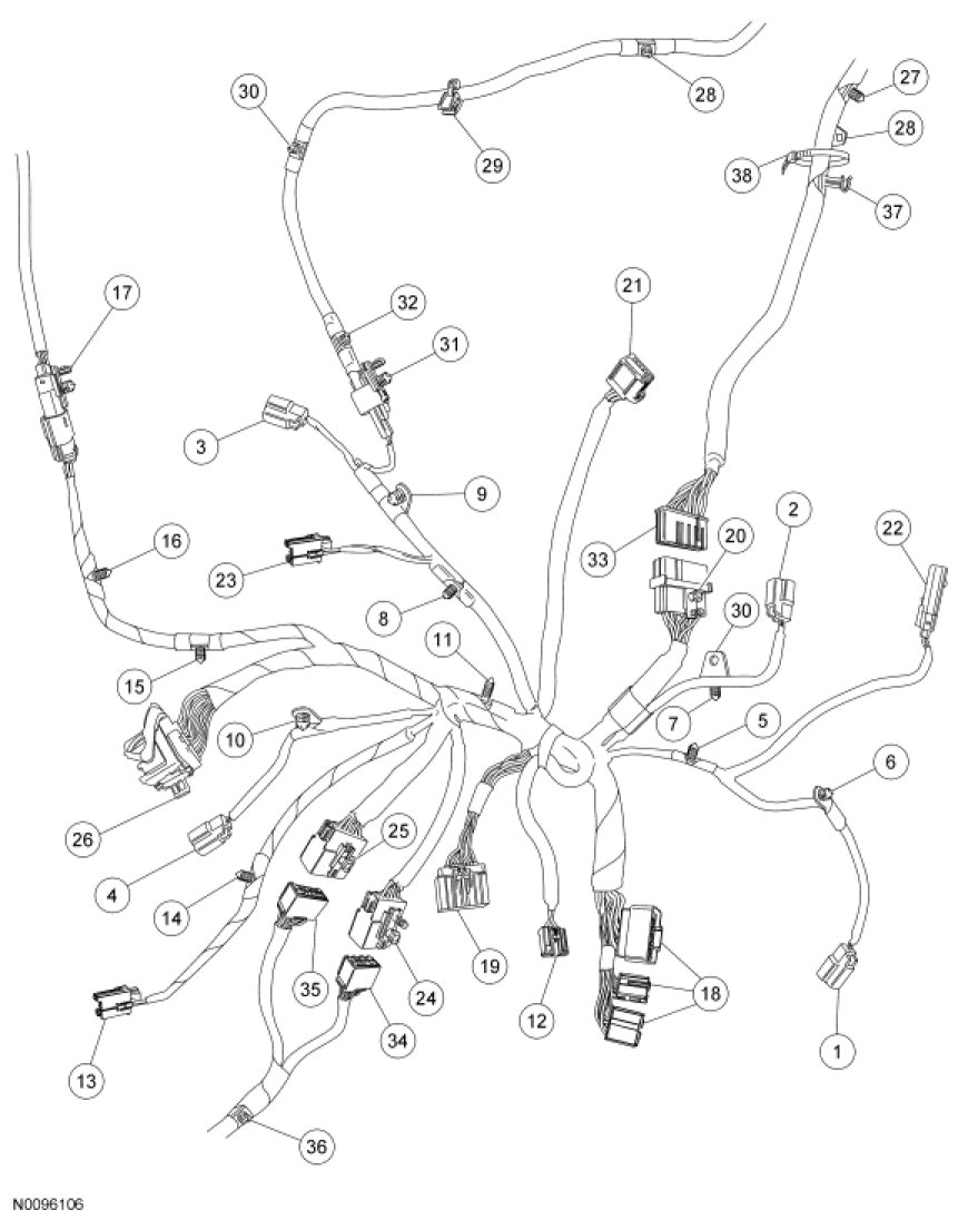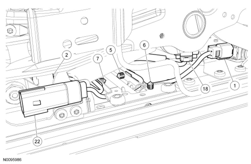 - Match the numbers in the wire harness view to the numbers in the retainer and connector location views and attach accordingly.