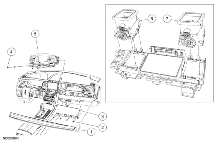 5. Remove the 5 center instrument panel finish panel screws and the trim panel.