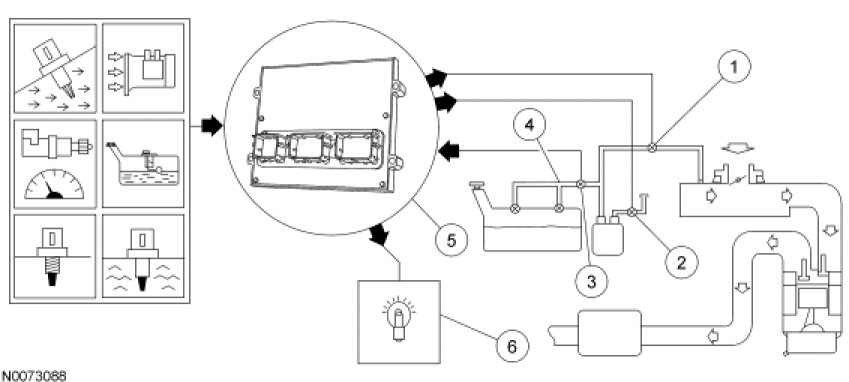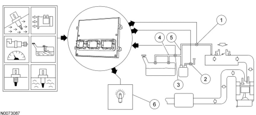 4. The EONV EVAP leak check monitor uses the naturally occurring change in fuel tank pressure as a means to detect a leak in the EVAP system. At ignition off, a target pressure and vacuum is determined by the PCM. These target values are based on the fuel level and the ambient temperature at ignition off. As the fuel tank temperature increases, the pressure in the tank increases and as the temperature decreases a vacuum develops. If a leak is present in the EVAP system the fuel tank pressure or vacuum does not exceed the target value during the testing time period. The EONV EVAP leak check monitor begins at ignition off.
