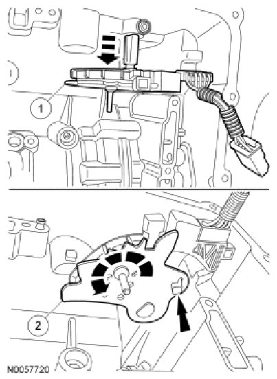 2. Rotate the TR sensor detent plate counterclockwise, as viewed from below until the plate rests against the transaxle case, remove the park pawl actuating rod from the TR sensor and remove the TR sensor.