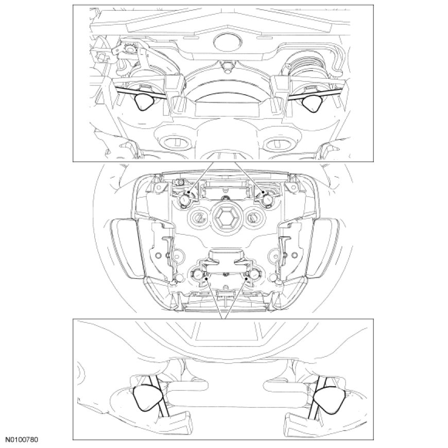- From the back of the steering wheel through the upper access hole, use a suitable tool to pry the upper wire clips away from the air bag module attachment pins.