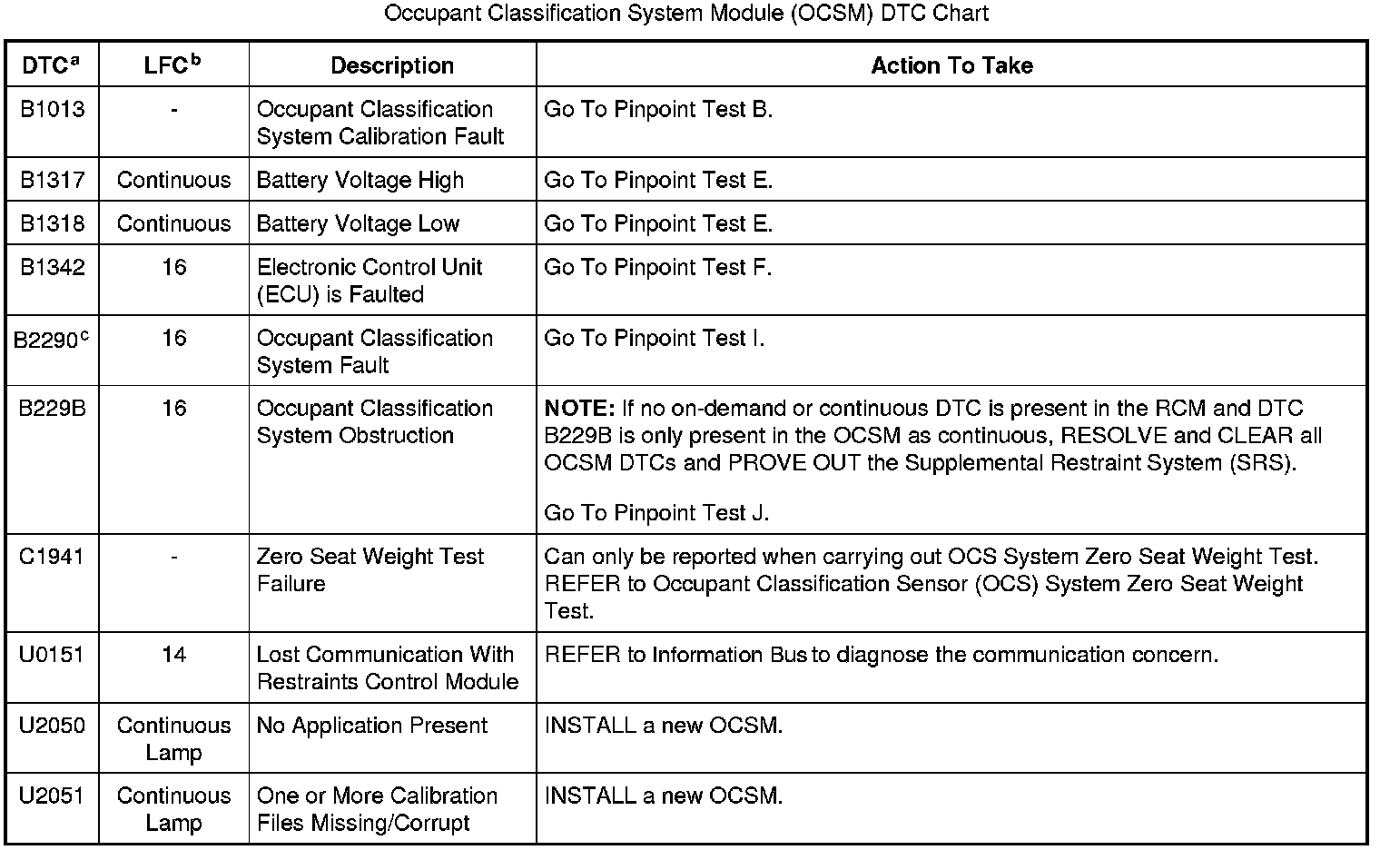 While the Lamp Fault Codes (LFCs) are an indication of a general concern in the passive restraints system, the DTCs are more specific. The DTCs can be retrieved from the RCM and OCSM with a scan tool via the DLC.