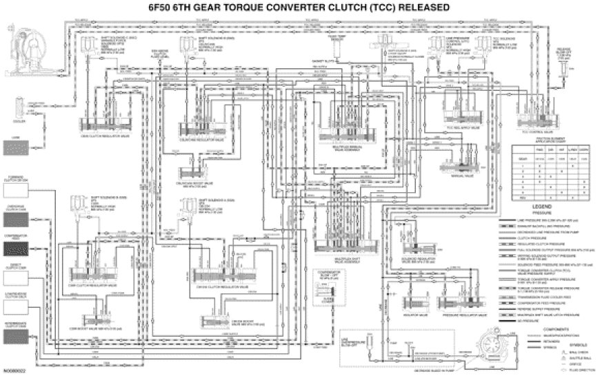 - Regulated line pressure from the pressure regulator valve is directed to the TCC control valve through the CONV FD hydraulic circuit.