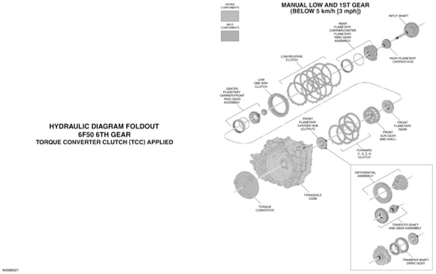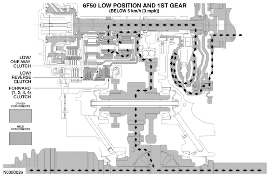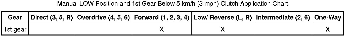 NOTE: The transaxle operates differently in first gear above and below 5 km/h (3 mph). For transaxle operation above 5 km/h (3 mph), refer to 1st Gear Above 5 km/h (3 mph).