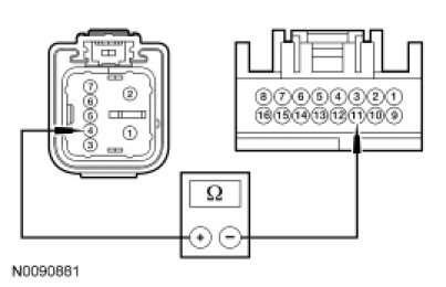 - Measure the resistance between RH front window motor C608-4, circuit CPW13 (BN/YE), harness side and LH front window control switch C504-11, circuit CPW13 (BN/YE), harness side.