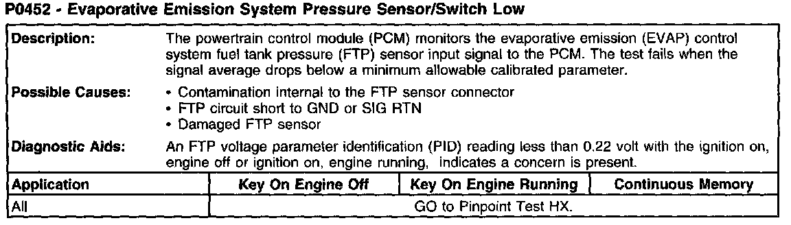 P0452 - Evaporative Emission System Pressure Sensor/Switch Low: