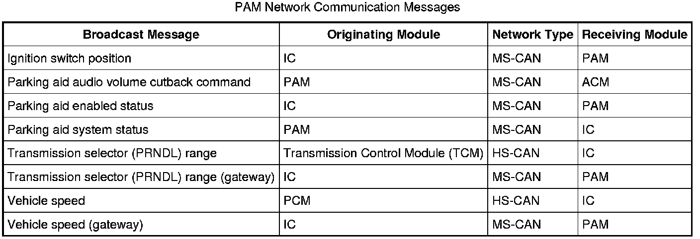 The PAM is on the Medium Speed Controller Area Network (MS-CAN) and can be diagnosed with a scan tool. The PAM communicates with the scan tool, the SJB, the Audio Control Module (ACM) and the Instrument Cluster (IC). The following chart describes network messages used by the PAM: