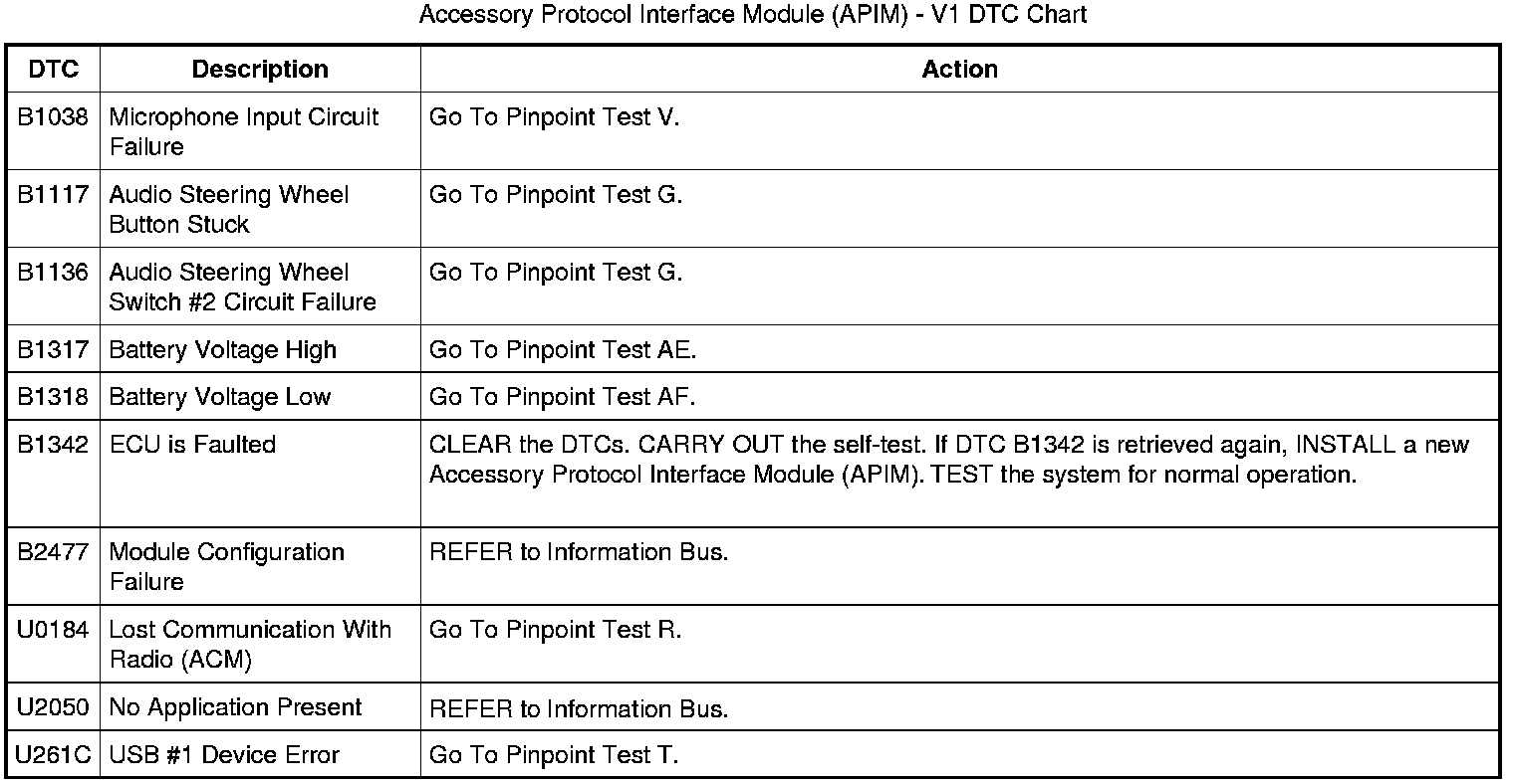 Accessory Protocol Interface Module (APIM) - V1 DTC Chart