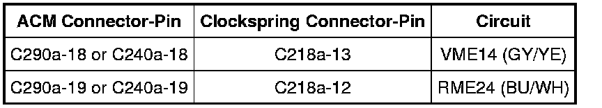 - For a concern with the VOL-, VOL+, SEEK-, SEEK+, or MEDIA buttons, measure the voltage between the clockspring C218a-13, circuit VME14 (GY/YE), harness side and ground.