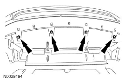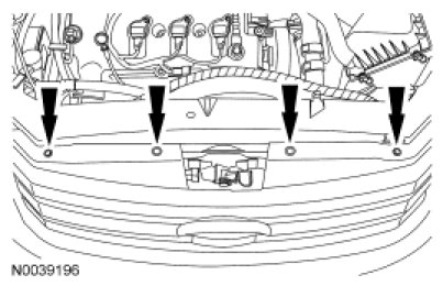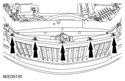 7. Remove the 2 bolts and the 2 pin-type retainers from the top of the radiator grille.