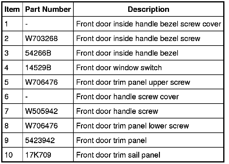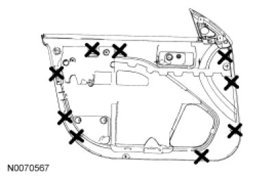 8. NOTE: The back of the front door trim panel shown with the location of the front door trim panel pin-type retainers indicated.