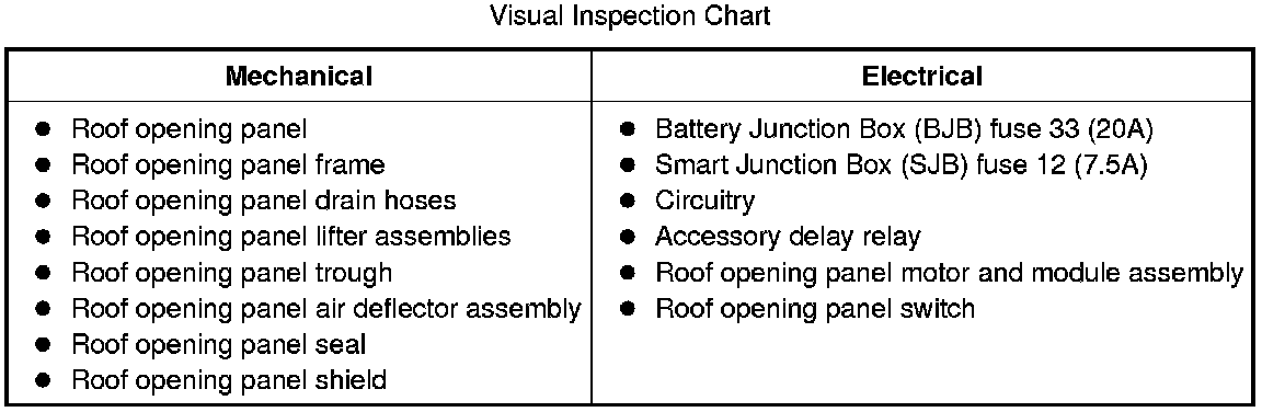 4. If the concern is not visually evident, determine the symptom. GO to Symptom Chart - Roof Opening Panel or GO to Symptom Chart - NVH. Symptom Related Diagnostic Procedures