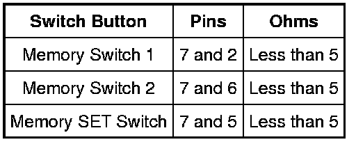 - Measure resistance between memory SET switch pins, component side, while pressing the indicated buttons using the following chart and illustration: