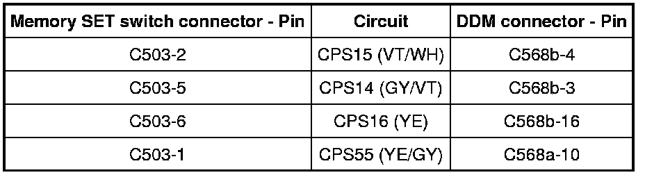 - Measure resistance between memory SET switch C503 pins and DDM C368b pins; and between memory SET switch C503 and DDM C368a using the following chart: