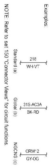 Connector Views show the views of the pins and/or cavities of all connectors. The pin and cavity sides are shown separately as if the connector were disconnected. The color of the connector housing is indicated next to the connector number when available. The harness causal number is located above the connector view and below the connector number. The circuit function charts are located below each connector. The wiring harness designations are listed in Component Location Charts.