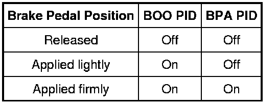 - Monitor the PCM PIDs BOO (brake pedal top travel) and BPA (brake pedal bottom travel). while applying and releasing the brake pedal as follows:
