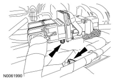 90. Attach the 2 wiring harness retainers to the transmission mount and the battery tray bracket.