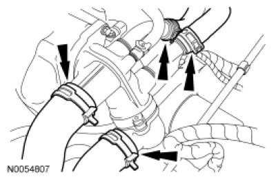 86. Connect the upper radiator hose, lower radiator hose and 2 heater hoses to the thermostat housing.