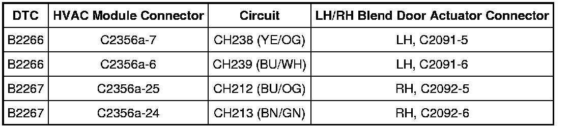 - For DTC B2266, LH blend door actuator C2091-7, circuit RH111 (GY/BU), harness side.