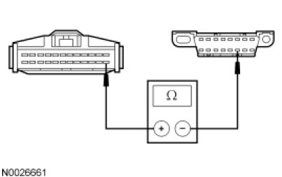 - Measure the resistance between the TCM C1533-14, circuit VDB04 (WH/BU), harness side and the DLC C251-6, circuit VDB04 (WH/BU), harness side.