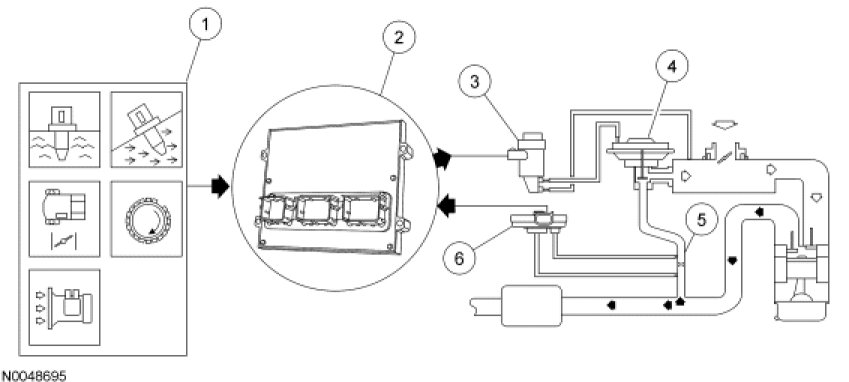 The differential pressure feedback EGR system consists of a differential pressure feedback EGR sensor, EGR vacuum regulator solenoid, EGR valve, orifice tube assembly, powertrain control module (PCM), and connecting wires and vacuum hoses. For additional information on the differential pressure feedback EGR system, refer to Engine Control Components Engine Control Components. Operation of the system is as follows: