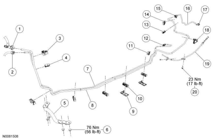 6. NOTE: Some residual fuel may remain in the fuel tubes after releasing the fuel system pressure. When disconnecting or removing any fuel tubes, carefully drain any residual fuel into a suitable container.