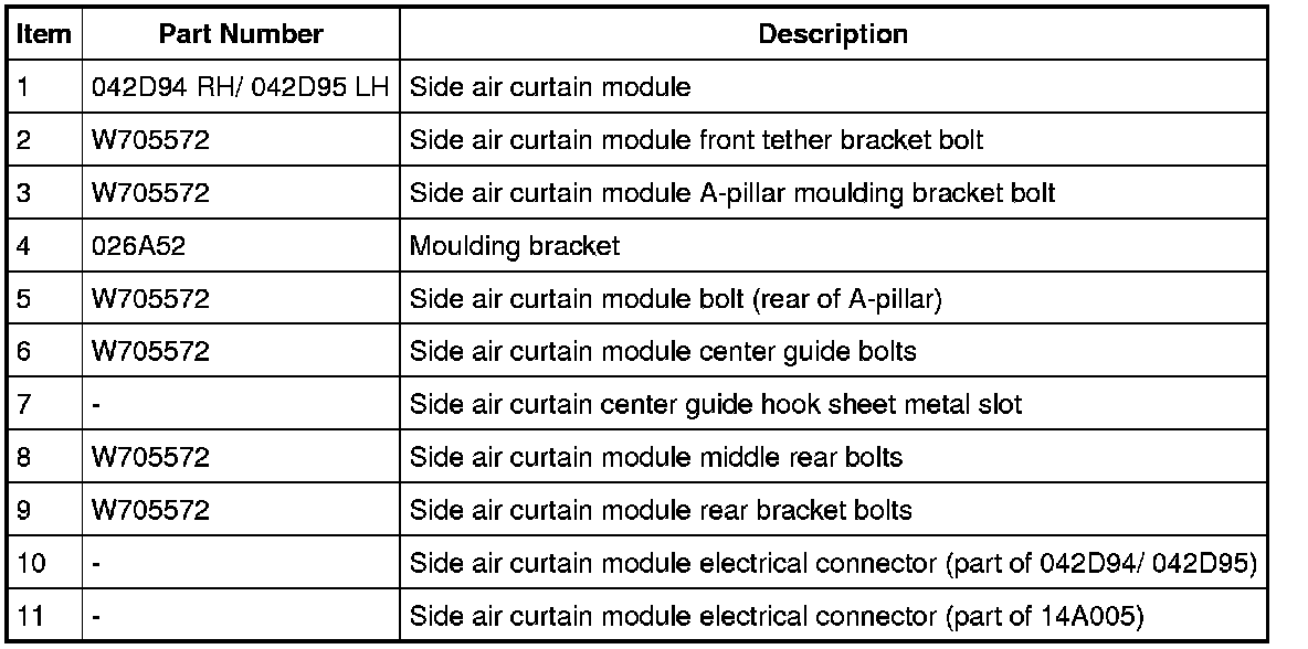 WARNING: Anytime the Safety Canopy(R) or side air curtain module has deployed, a new headliner and new A-, B- and C-pillar upper trim panels and attaching hardware must be installed. Remove any other damaged components and hardware and install new components and hardware as needed. Failure to follow these instructions may result in the Safety Canopy(R) or side air curtain module deploying incorrectly and increases the risk of serious personal injury or death in a crash.
