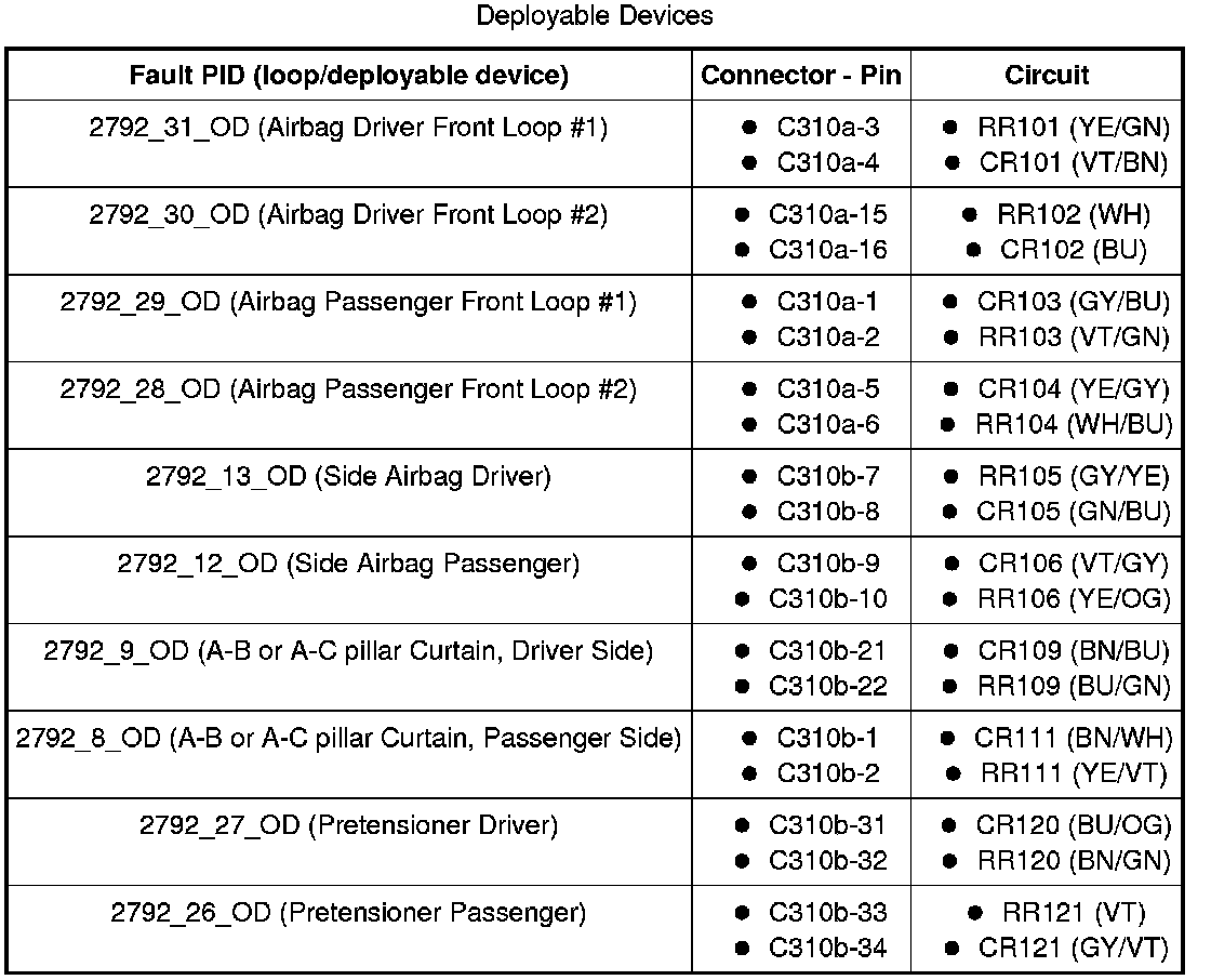 - Using the fault PIDs recorded and the following table, measure the resistance between the circuits of the affected deployable devices.