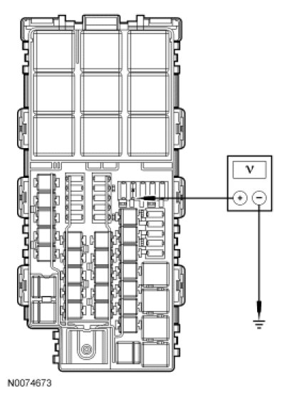- Measure the voltage between Battery Junction Box (BJB) starter diode cell, circuit CDC35 (BU/WH) and ground with the ignition switch in the START position.