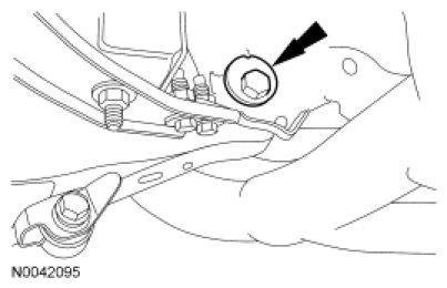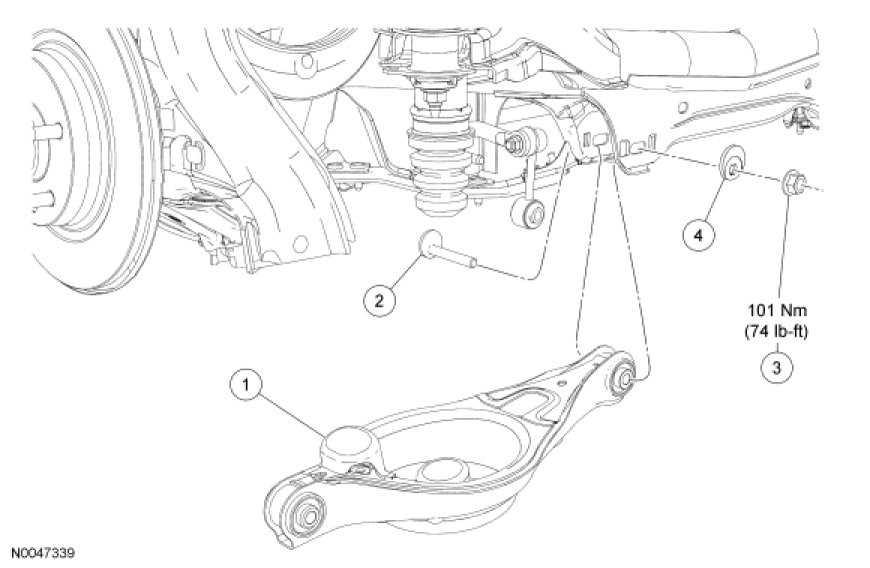 - To install, tighten the new nut to 101 Nm (74 lb-ft) with the suspension at the bushing fastener tightening position.