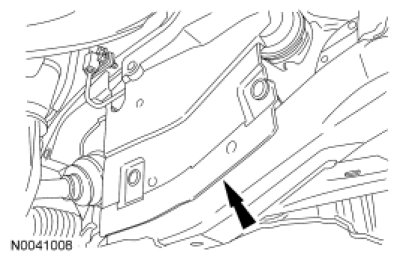27. Position the RH front structure-to-subframe splash shield in place and install the 6 pin-type retainers.