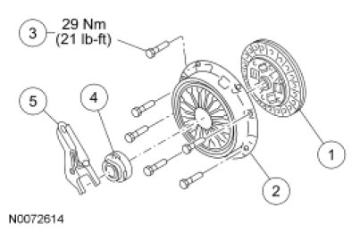 Using a suitable clutch disc aligner, remove the bolts, the clutch pressure plate and the clutch disc.