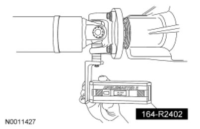 6. If the angle is not within specifications, repair or adjust to obtain the correct angle. Inspect the engine mounts, transmission mounts, center support bearing mounting, rear suspension, rear axle, rear axle mounting or the frame for wear or damage.