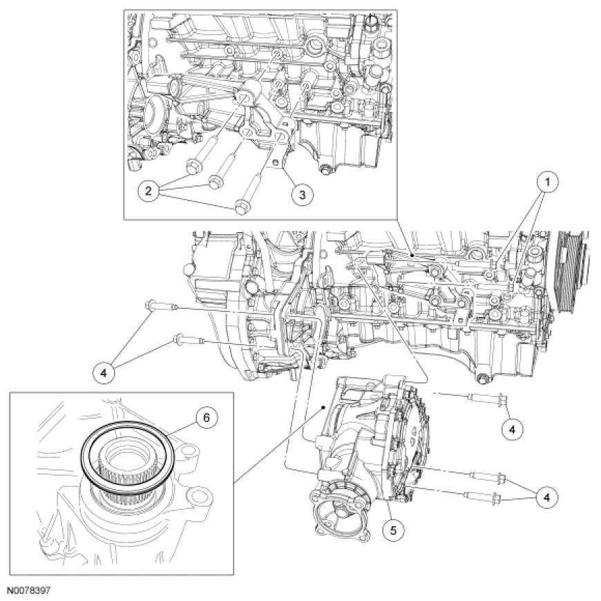 4. Remove the 2 Power Transfer Unit (PTU)-to-support bracket bolts, then remove the 3 PTU support bracket bolts and the PTU support bracket.