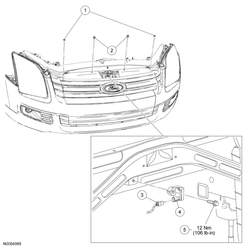 3. While gently positioning forward the upper grille, remove the bolt from the front impact severity sensor assembly.