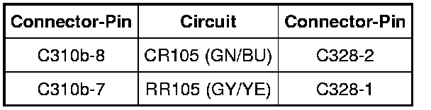 - Connect a jumper wire between driver side air bag C328-2, circuit CR105 (GN/BU), harness side and C328-1, circuit RR105 (GY/YE), harness side.