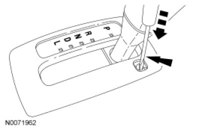 NOTE: If it is necessary to use the override procedure to move the selector lever out of the PARK position, it is possible that a fuse has blown and the brake lights are not operational. Before driving the vehicle, verify that the brake lights are working. This vehicle is equipped with a brake shift interlock feature that prevents the selector lever from being moved out of PARK when the ignition is in the ON position unless the brake pedal is depressed.