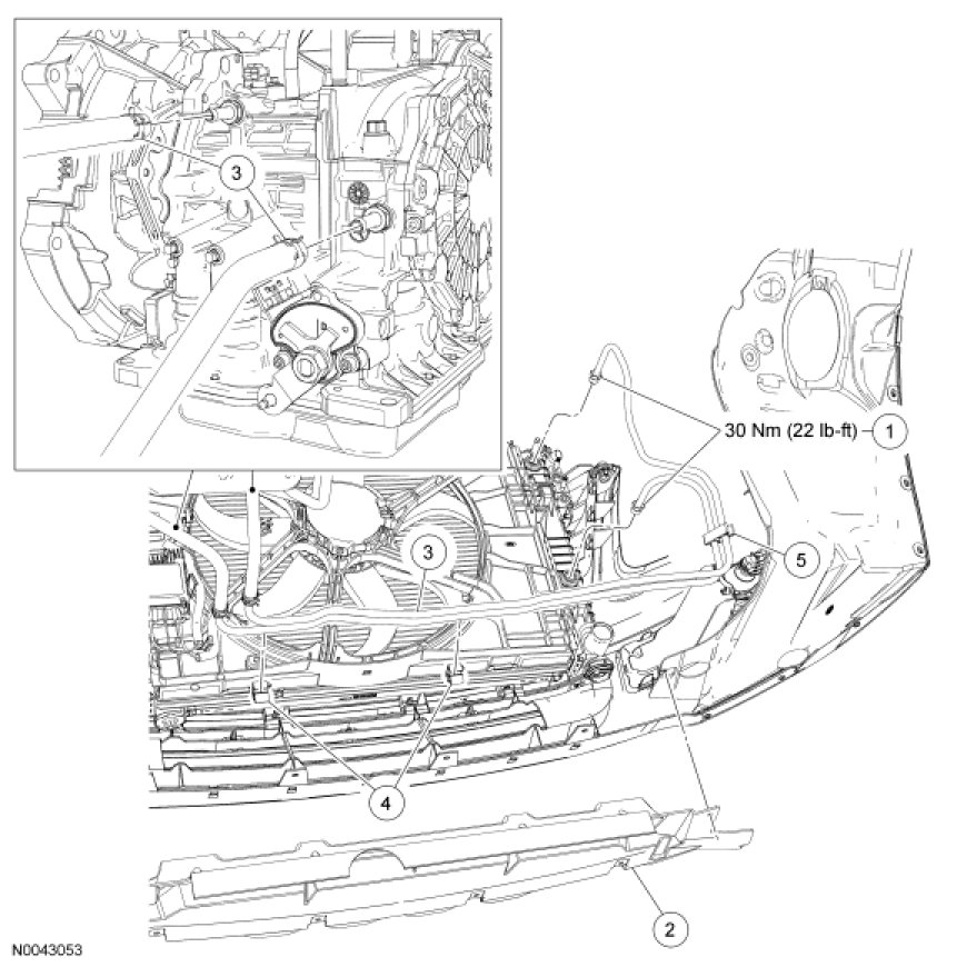 3. NOTE: The power steering hose is routed between the 2 transmission fluid cooler hoses.