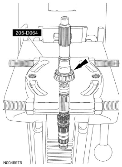 Using the Bearing Puller and a suitable press, press off the synchronizer hub assembly, the synchronizer blocking ring and 3rd gear as an assembly.