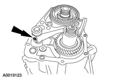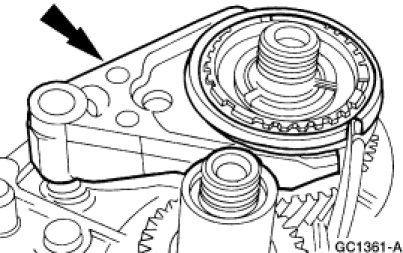 15. Remove the reverse/5th shift fork and synchronizer hub assembly.