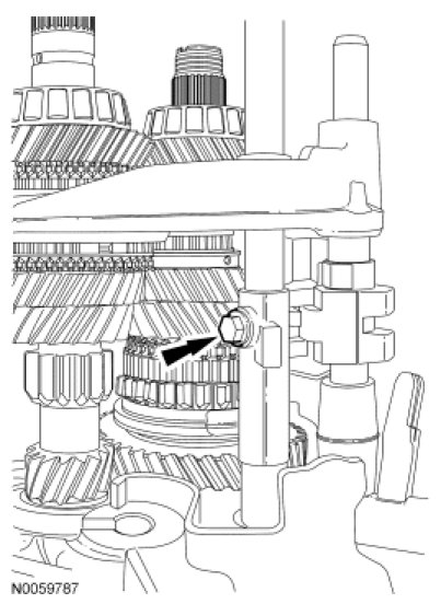 20. Remove the reverse idler shaft lock bolt and shift rail guide bolt.