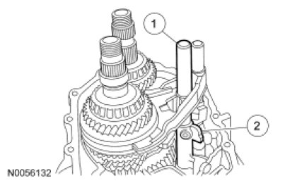 14. Remove and discard the reverse/5th shift fork roll pin.